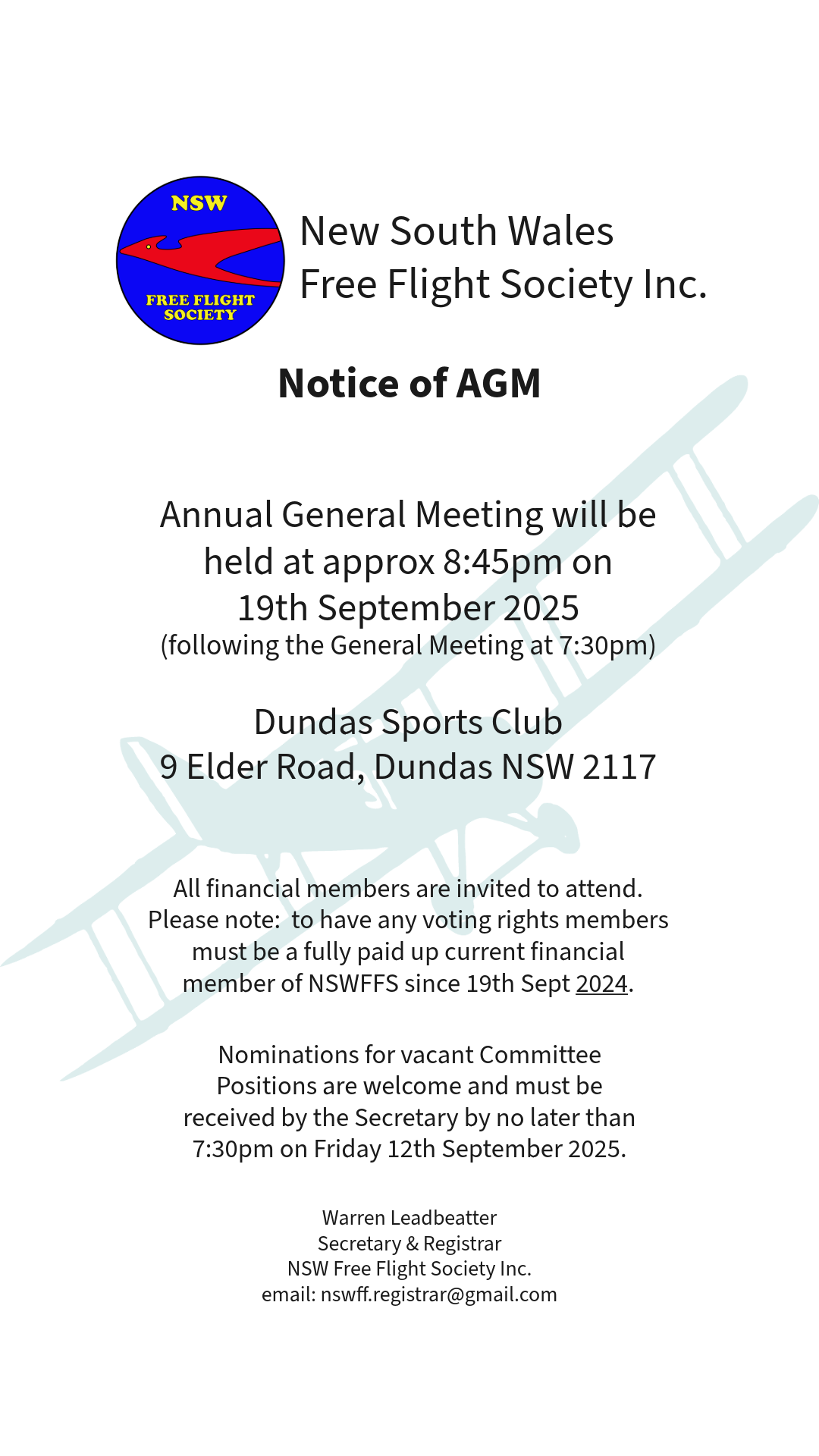 2025 AGM Notice - The 2025 AGM will be held immediately following the General Meeting to be held on on 19th Sept 2025 at 7:30pm - Dundas Sports Club, 9 Elder Road, Dundas NSW 2117